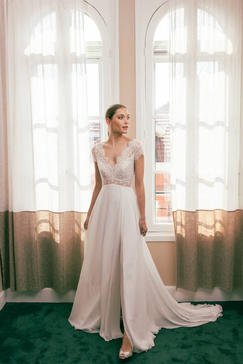 Le buste en dentelle a été travaillé dans ses moindres détails : le haut en V, les petites manches, la ceinture transparente qui marque subtilement le tracé de la taille haute, le décolleté keyhole du dos.