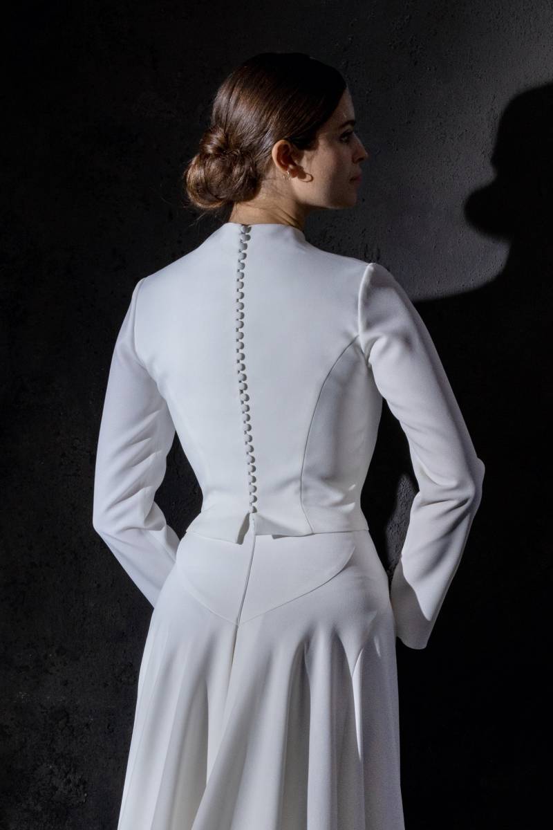 Le top de cette robe de mariée se distingue par son col rond montant en crêpe, apportant une touche de sophistication et minimaliste. Les manches longues, finement terminées par de petits boutons ajoutent une note d’élégance discrète et raffinée.
