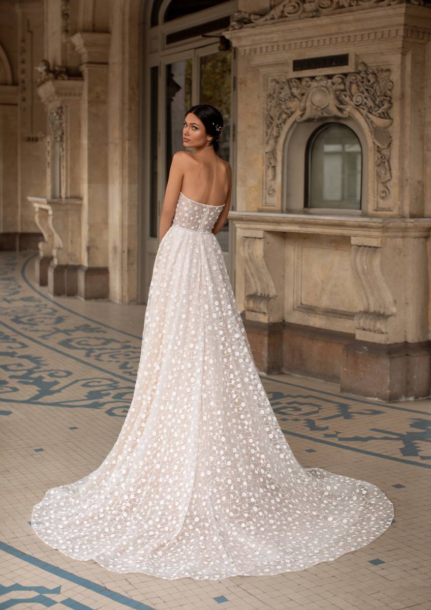 Préparez-vous à réaliser votre rêve et surprenez tout le monde à votre mariage avec HOPKINS, robe de mariée tout en légèreté avec sa petite traîne.