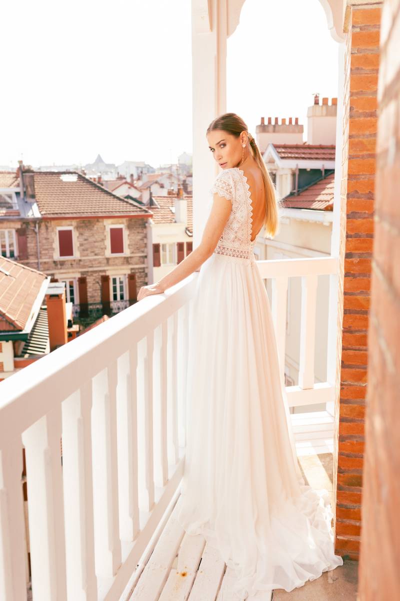 Le modèle Rimelle vous propose une déclinaison à la fois chic et traditionnelle de la robe de mariée bohème : un haut dentelle façon broderie avec petites manches, une jupe fluide en mousseline au tombé impeccable.