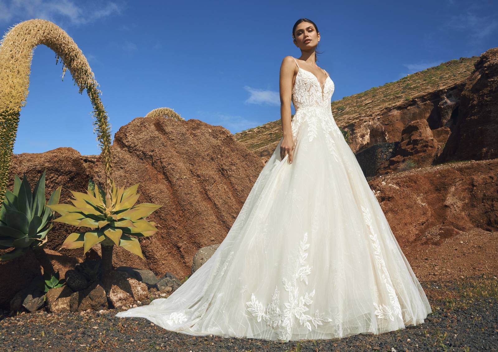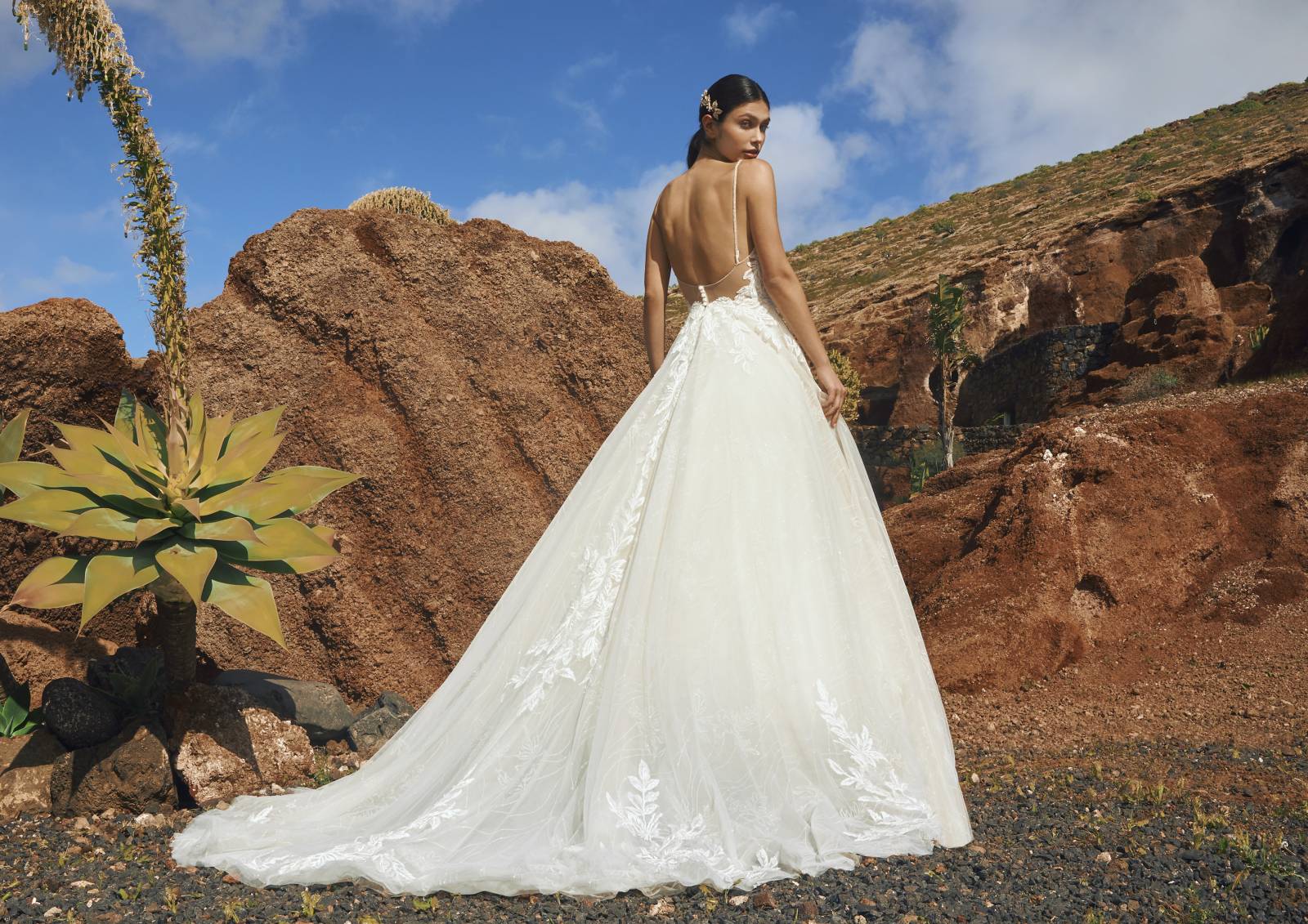 Modèle de robe de mariée chic et classique by Pronovias : un corsage ajusté en dentelle stretch et décolleté V, un effet nude dans le bas du dos pour donner de la profondeur.