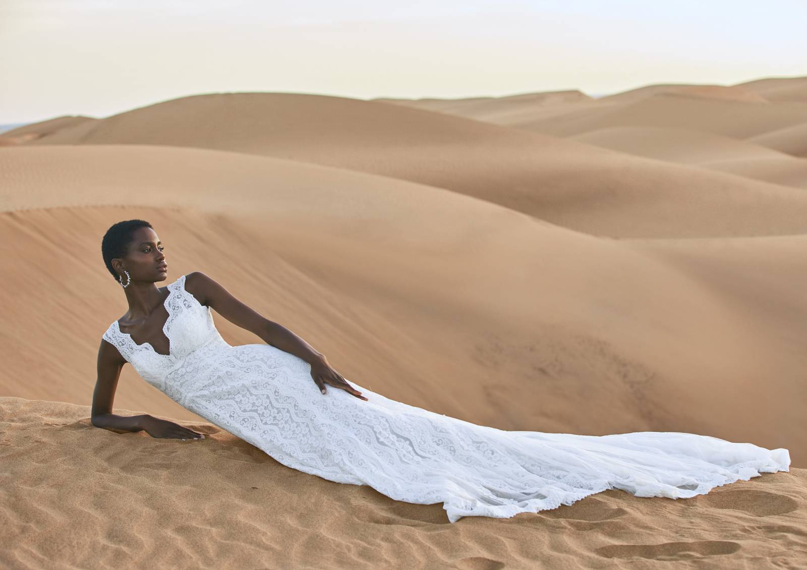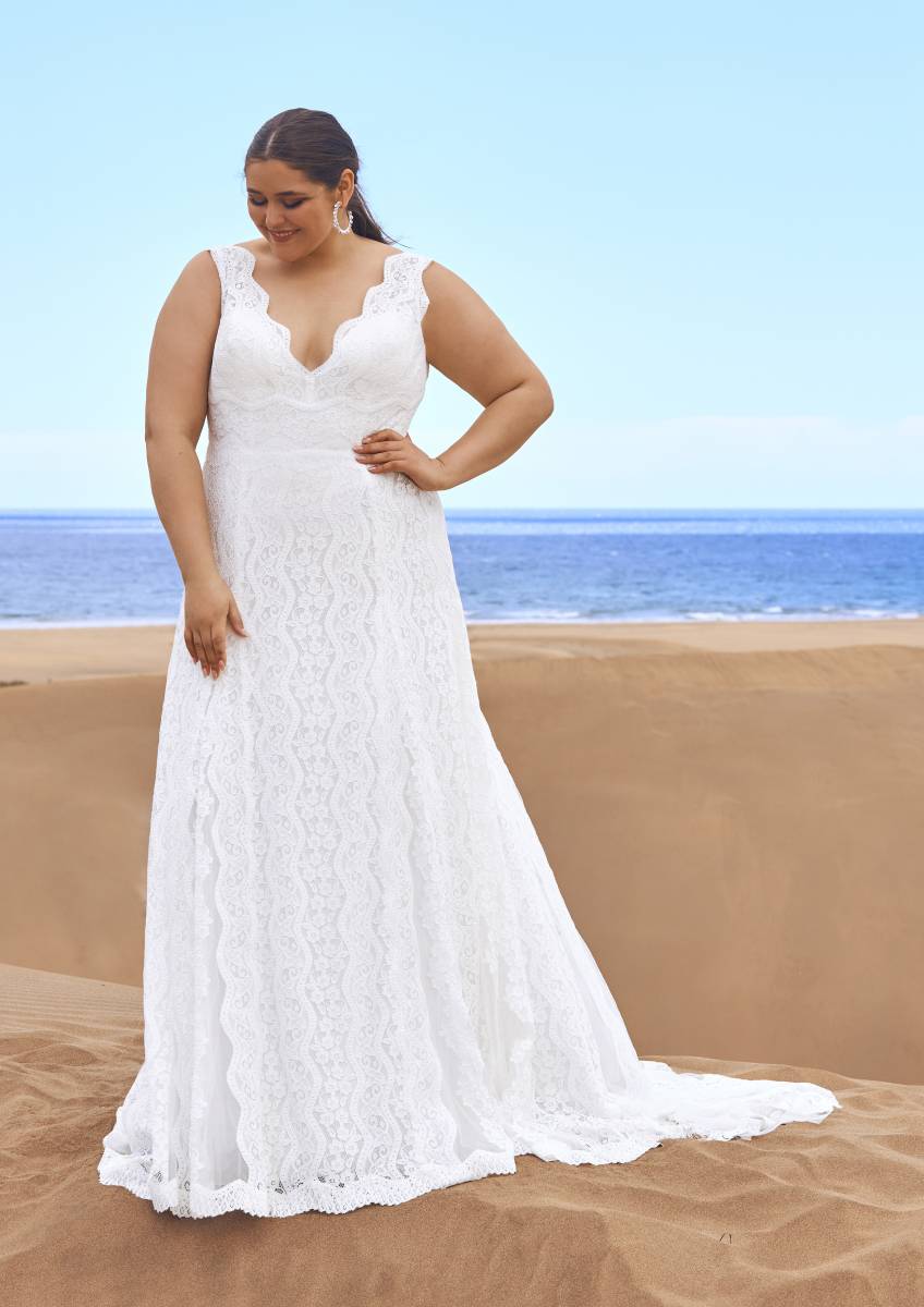 Une robe de mariée toute en longueur signée Pronovias. La coupe droite de la jupe, la fluidité et le tombé du tissu en tulle et dentelle allongent la silhouette avec beaucoup de raffinement. Un boutonnage perles façon sequins vient parfaire le bas du décolleté du dos.