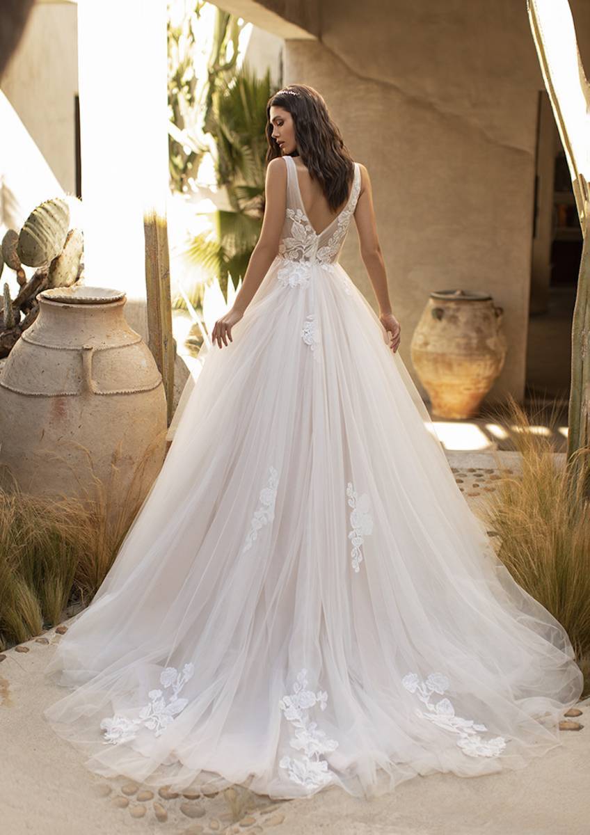 Une robe de mariée forme trapèze avec un décolleté plongeant et un dos en "V" avec effet de transparence. Sa jupe en tulle avec application de dentelle. Pour plus de volume nous pouvons lui apporter un jupon.