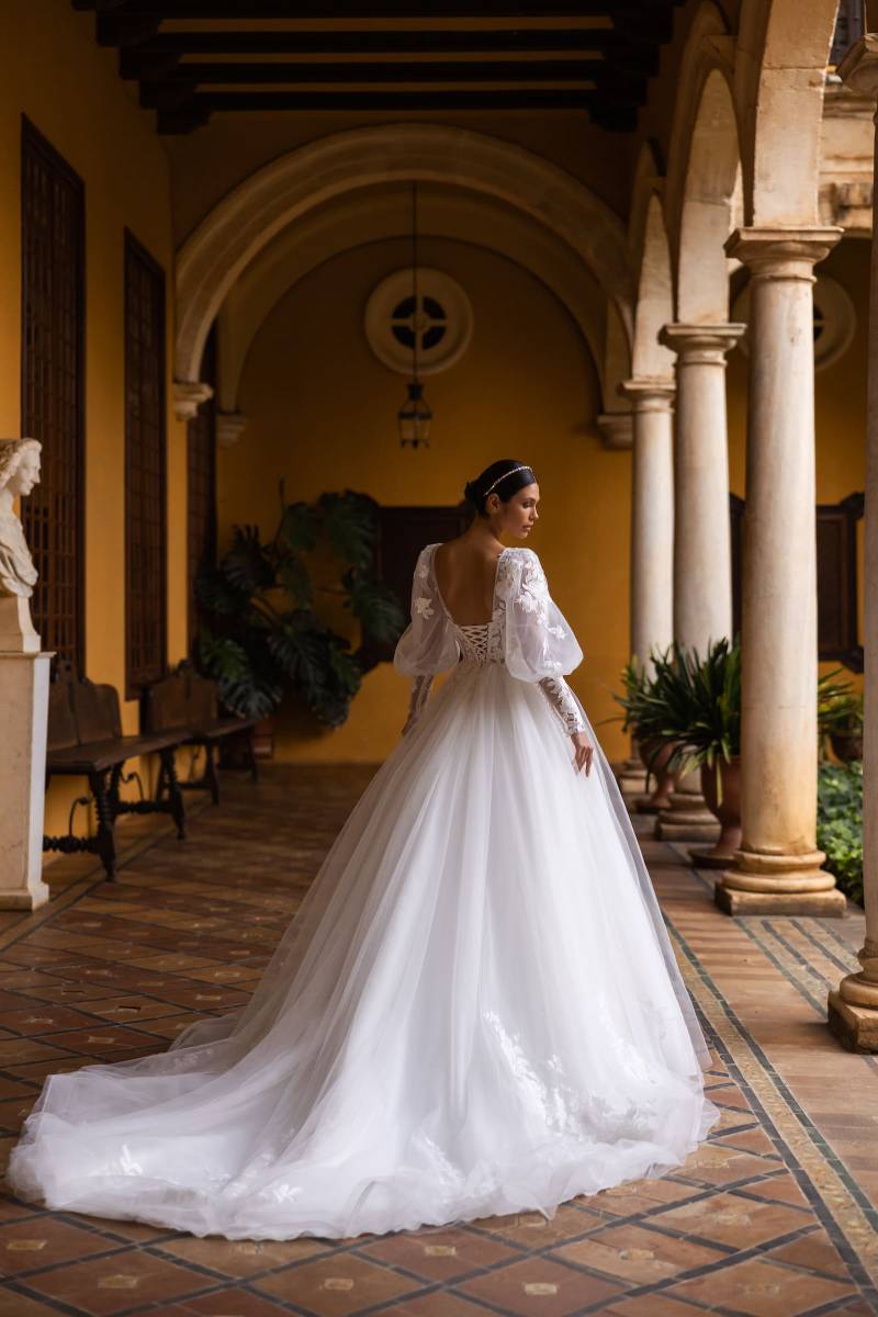 ROSEMARY intègre des manches bouffantes amovibles en tulle et dentelle, transparentes qui apporteront une touche d'originalité à la tenue.