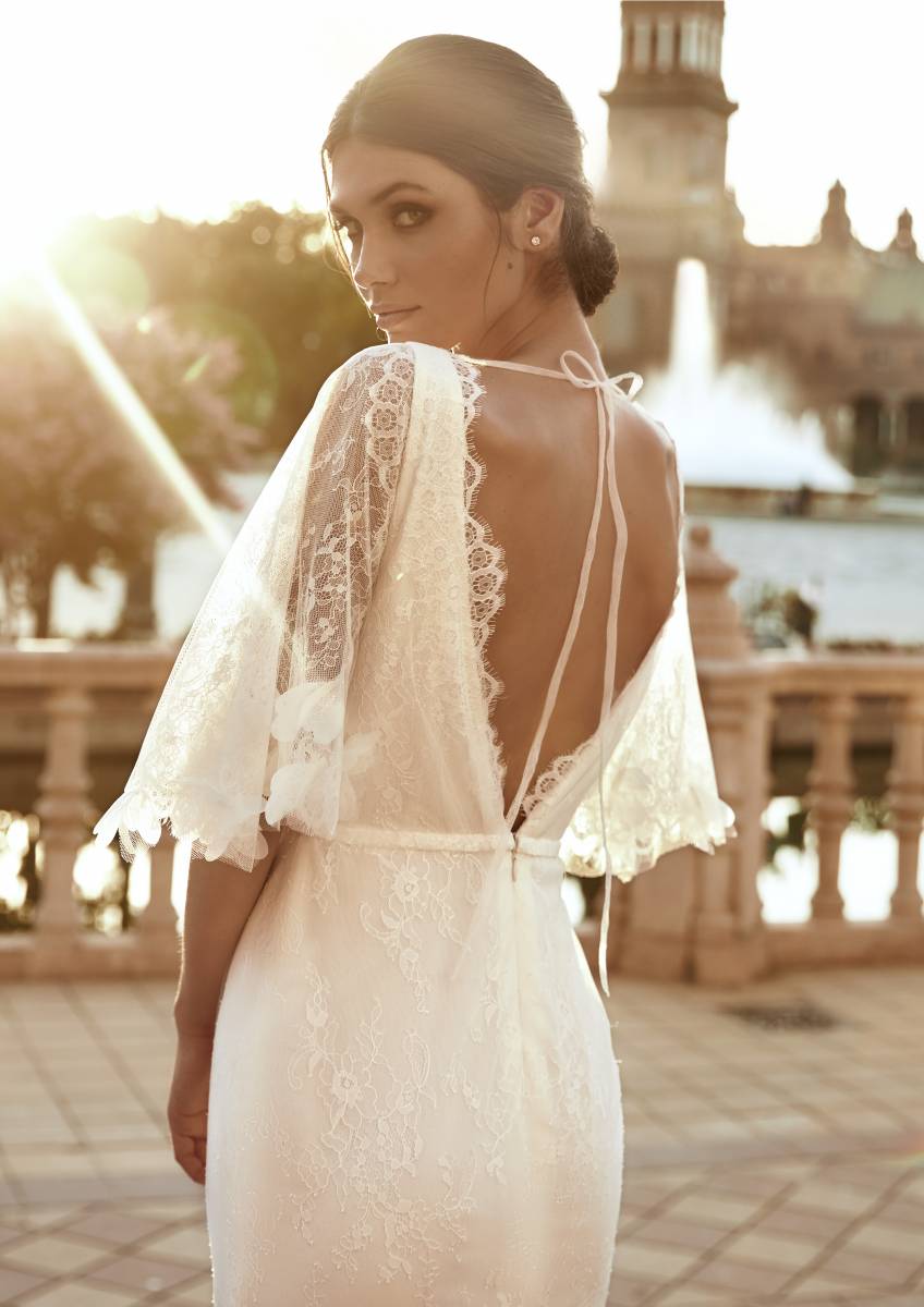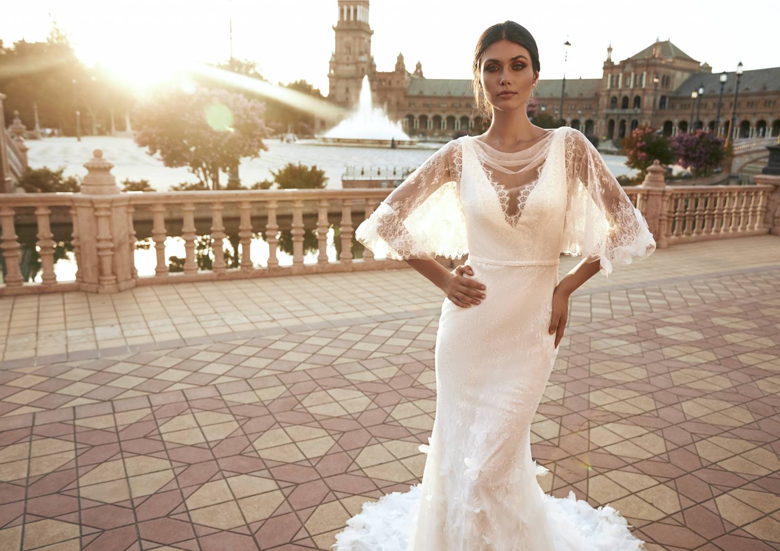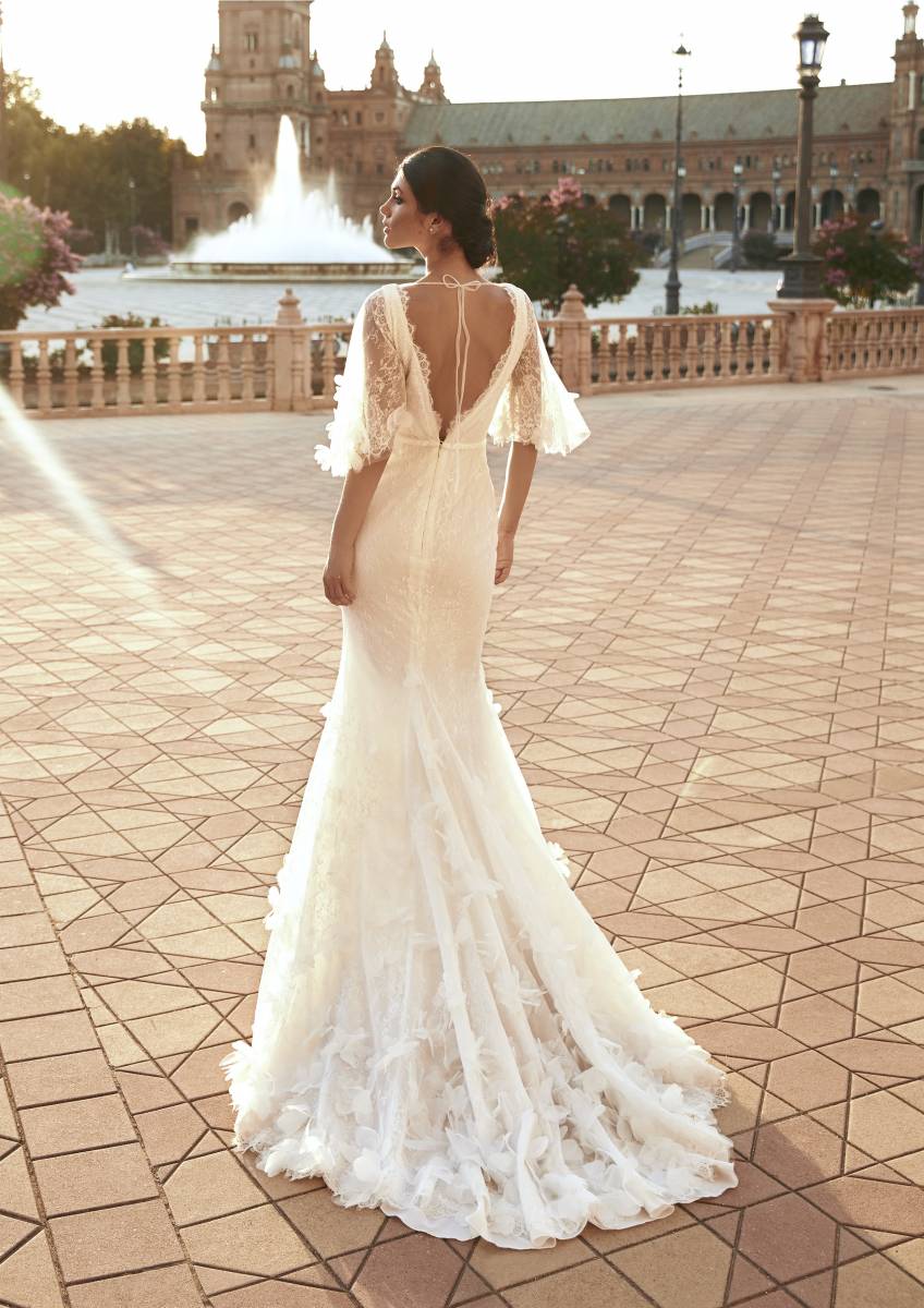 Le duo Marchesa et Pronovias vous offre avec le modèle ROC un cocktail de créativité : une robe fourreau tulle et dentelle blanche à manches cloches trois quarts avec encolure drapée et décolleté en V dans le dos délicatement noué au niveau du cou.