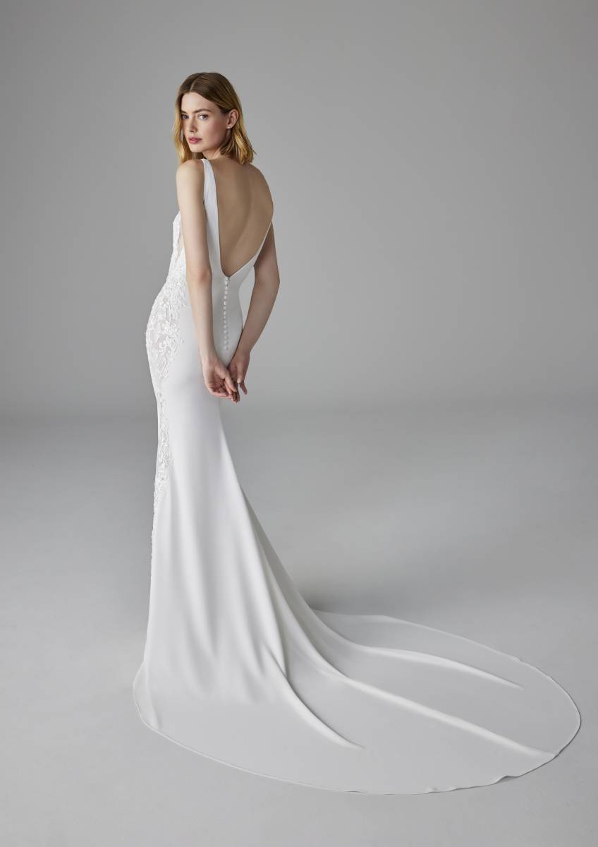 ELEA, robe de mariée sirène au décolleté en V, façonnée avec un crêpe de soie intemporel et agrémentée de détails en dentelle somptueux, se transforme en une œuvre d'art le jour du mariage. Un choix parfait pour celles qui souhaitent allier élégance classique et modernité audacieuse, tout en s'enveloppant de poésie et de lumière.