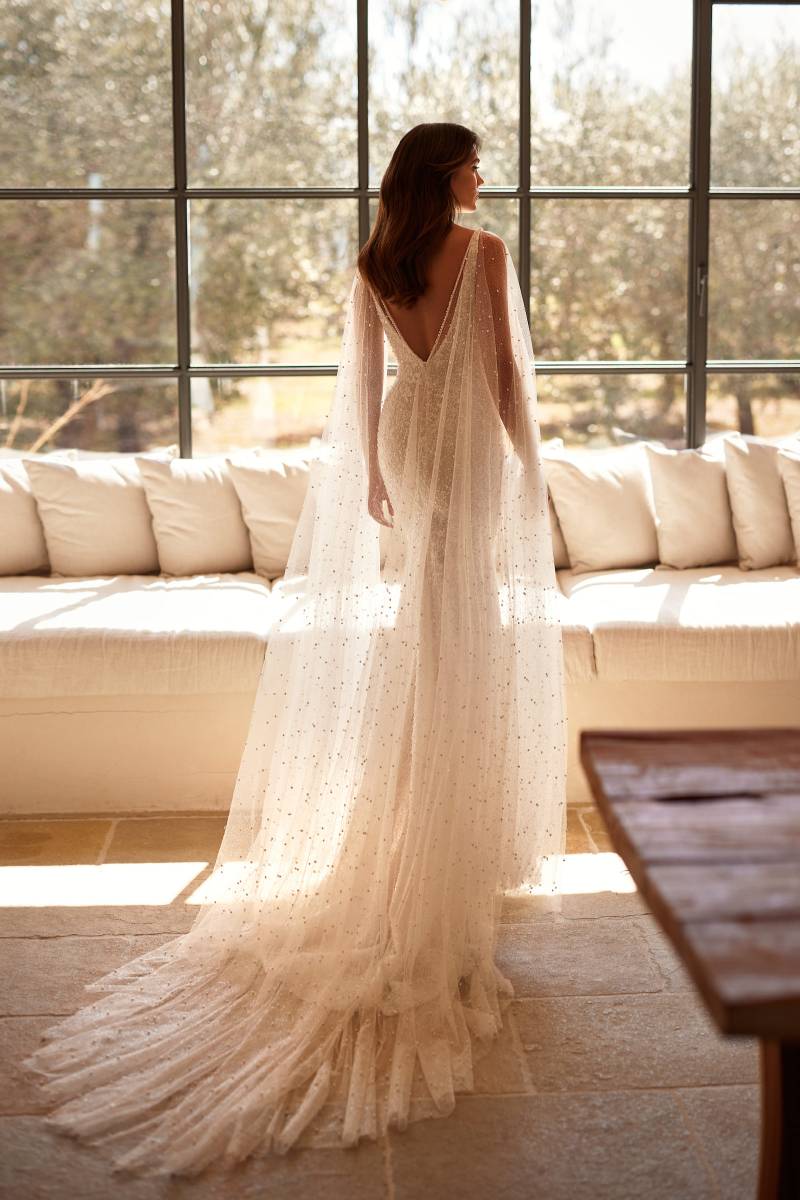 MARIA intègre une cape transparente amovible agrémentée de paillettes, délicatement ourlée de perles épousant le décolleté en V du dos qui ne manquera pas de faire son effet.
