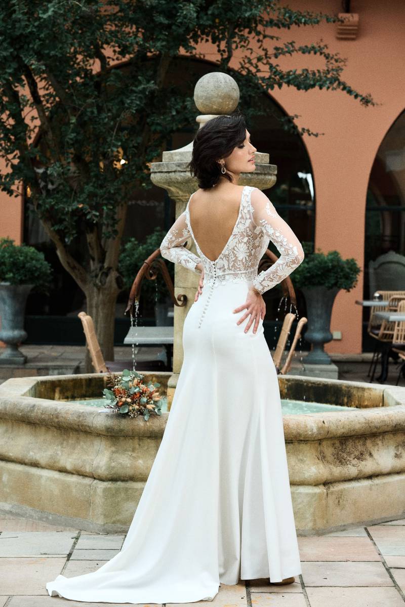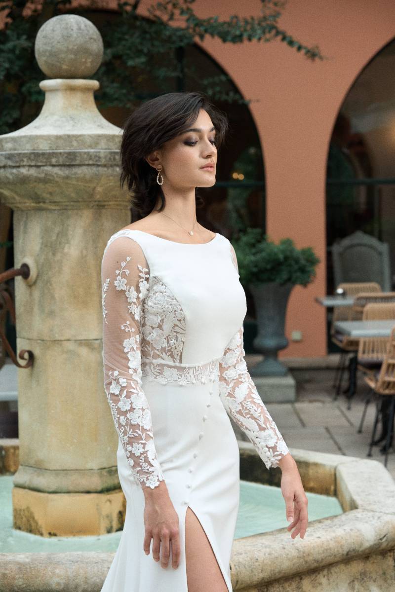 Sur un air d’une valse à trois temps, THENEA illumine par son chic sculptural. Cette robe de mariée fourreau révèle une allure aussi sexy qu’inattendue.